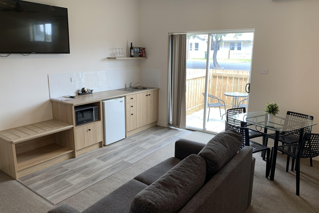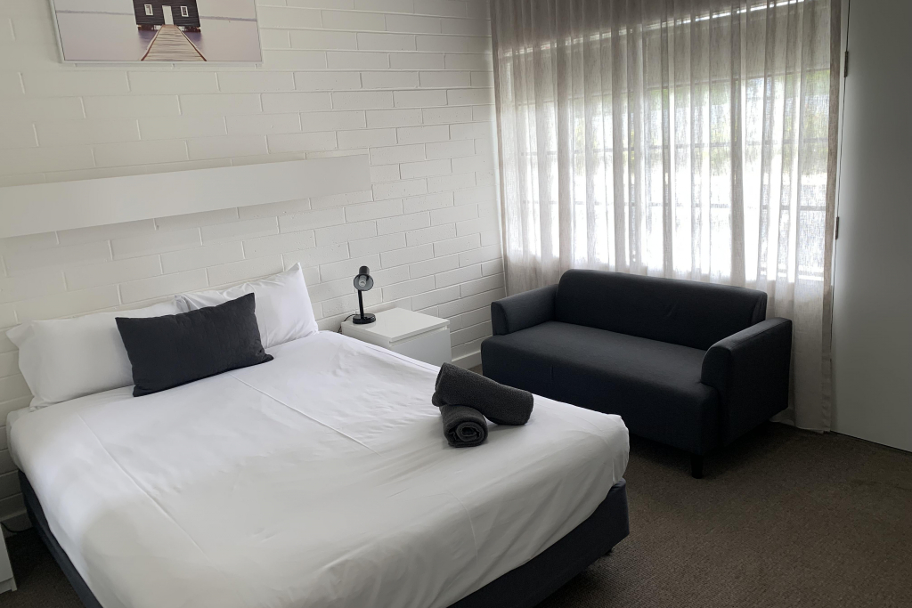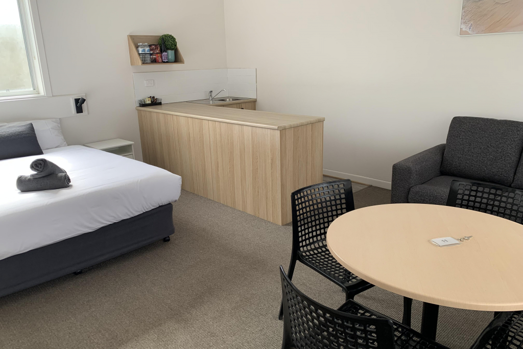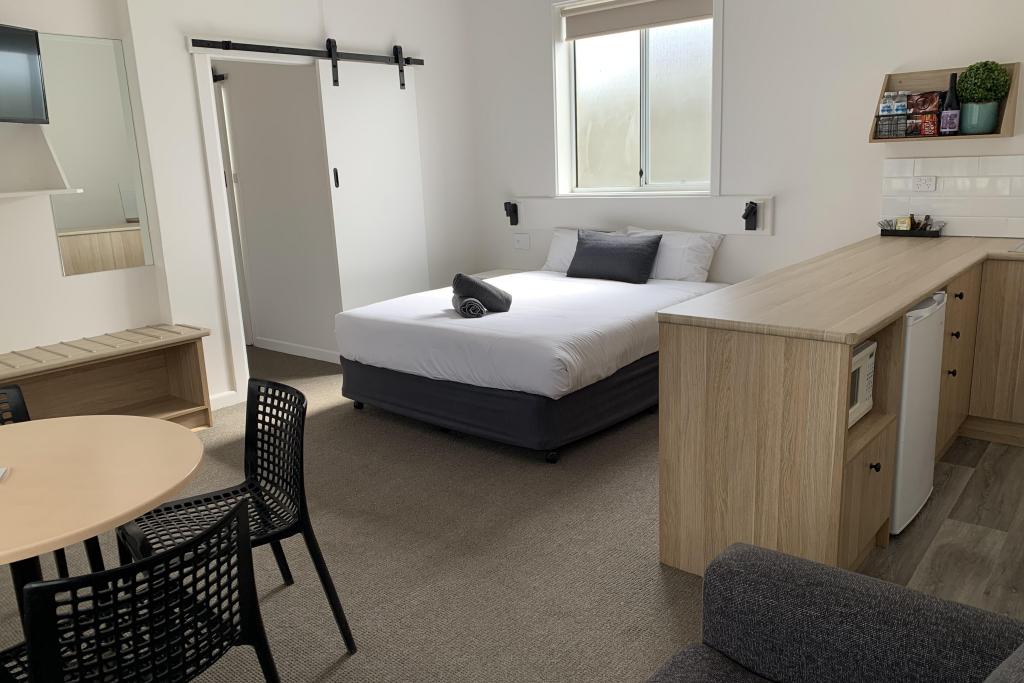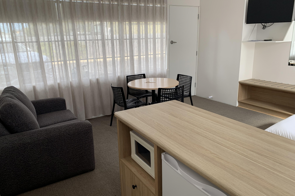 These newly renovated rooms feature a queen bed, 2-seater lounge, en-suite bathroom, and dining table with two chairs. You have crockery, cutlery, kettle, toaster and a microwave.