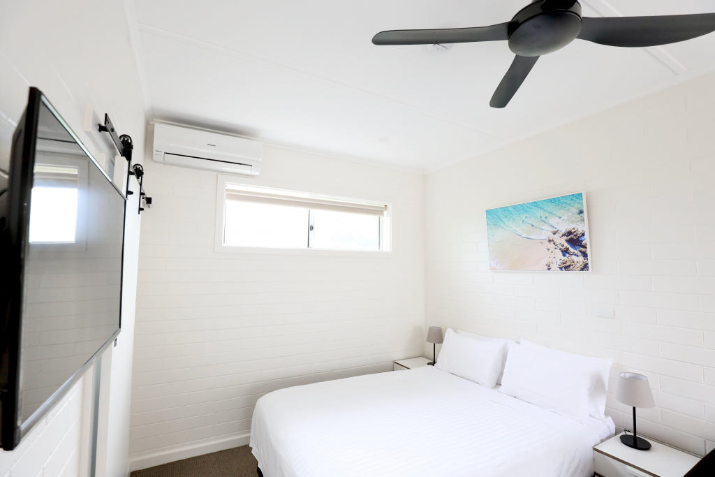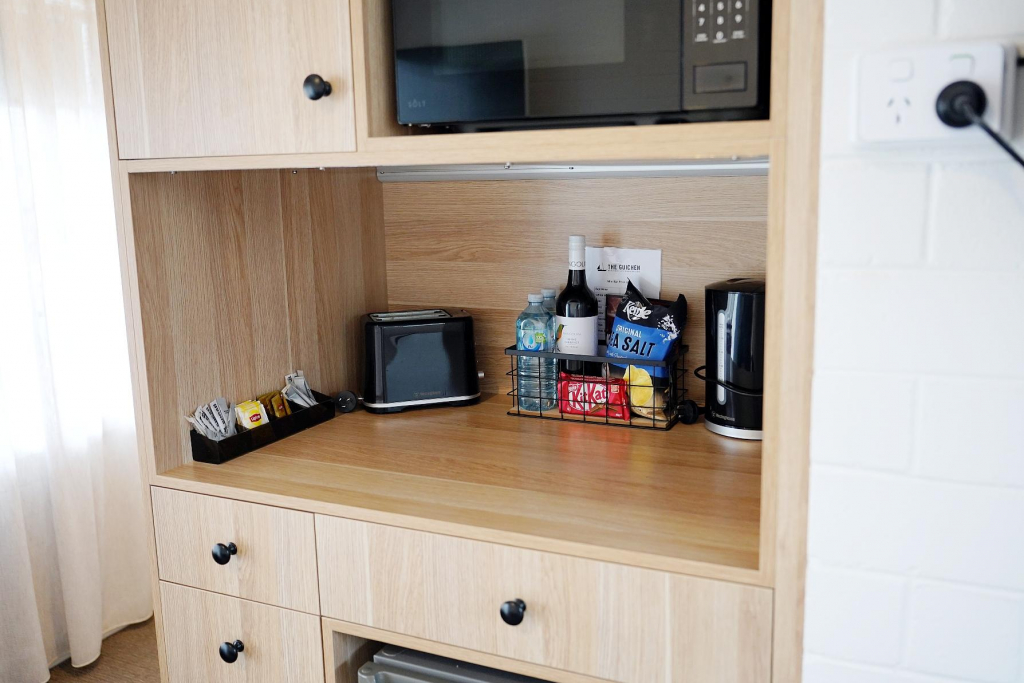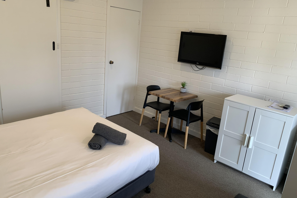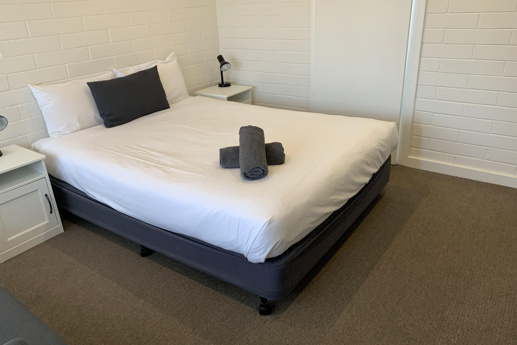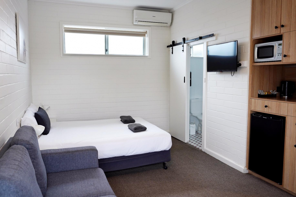 These newly renovated rooms feature a queen bed, 2-seater lounge, en-suite bathroom, and dining table with two chairs. You have crockery, cutlery, kettle, toaster and a microwave.