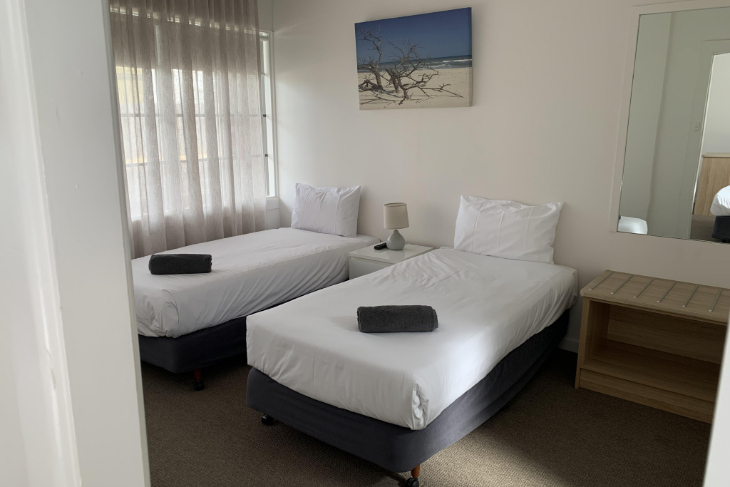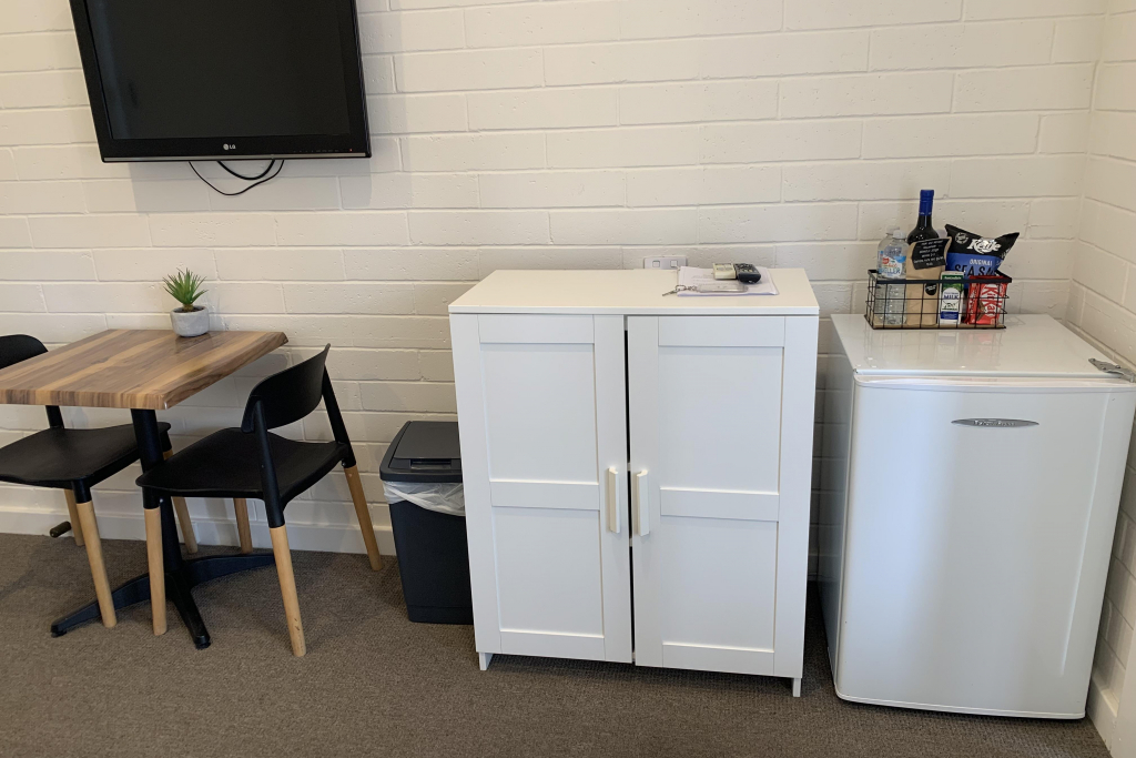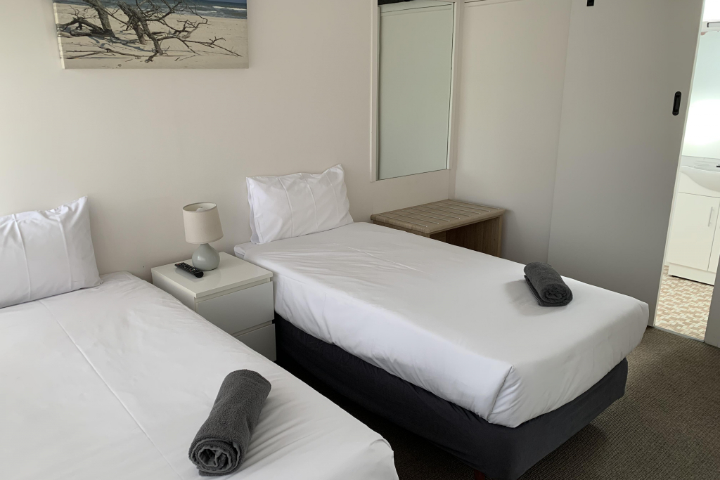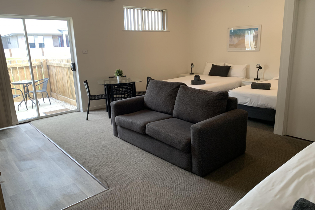 This room features a queen bed in the main living area with the kitchenette (no oven), and 2 single beds in the same room. 3-seater lounge and a dining table with 4 chairs. Free onsite parking and all linen are included. Note: this room has a glass sliding door opening onto a grassed area at the back of the motel suitable for parking a boat or trailer.